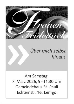 Herzliche Einladung zum Frauenfrühstück am 7. März, 9 Uhr, im Gemeindehaus.